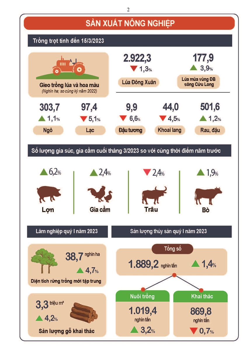 Trong khu vực nông, lâm nghiệp và thủy sản, giá trị tăng thêm ngành nông nghiệp quý I/2023 tăng 2,43% so với cùng kỳ năm trước, đóng góp 0,22 điểm phần trăm vào mức tăng tổng giá trị tăng thêm của toàn nền kinh tế; ngành lâm nghiệp tăng 3,66% nhưng chiếm tỷ trọng thấp nên chỉ đóng góp 0,02 điểm phần trăm; ngành thủy sản tăng 2,68%, đóng góp 0,06 điểm phần trăm.
