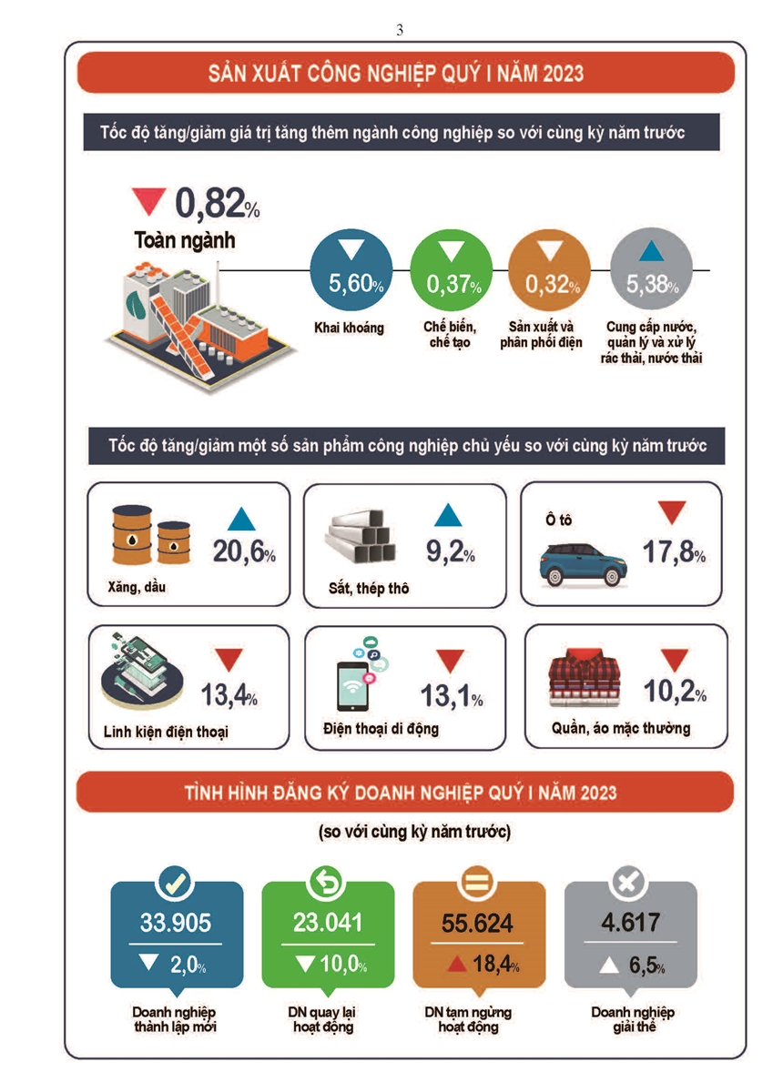 - Giá trị tăng thêm toàn ngành công nghiệp quý I năm 2023 ước tính giảm 0,82% so với cùng kỳ năm trước. Trong đó, ngành công nghiệp chế biến, chế tạo giảm 0,37%, làm giảm 0,1 điểm phần trăm vào mức tăng trưởng chung của toàn nền kinh tế. Chỉ số IIP ước tính giảm 2,2% so với cùng kỳ năm trước (cùng kỳ năm 2022 tăng 6,8%).