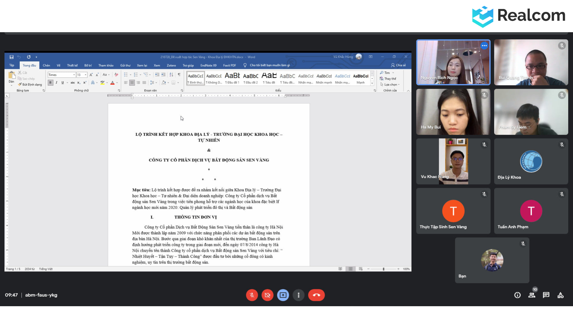 Vào những ngày đầu của tháng 8 năm 2021, Ban Lãnh đạo Khoa Địa Lý, trường Đại học Khoa học Tự nhiên, Đại học Quốc gia Hà Nội đã tổ chức buổi họp trực tuyến với Công ty Cổ phần Dịch vụ BĐS Sen Vàng để trao đổi về việc xây dựng Câu lạc bộ Nghiên cứu dự án Bất động sản cho các bạn sinh viên. Về phía khoa Địa lý có sự tham gia của thầy Bùi Trung Thành – Trưởng khoa Địa lý, cô Hoàng Thị Thu Hương – Phó Trưởng khoa Địa lý và một số thầy cô khác trong khoa. Về phía BĐS Sen Vàng có sự góp mặt của Ms. Bích Ngọc – CEO & Founder, Mr. Tuấn Anh – Giám đốc Kinh doanh, Ms. Hà My – Giám đốc Kinh doanh Quốc tế và Ms. Phạm Hương – Giám đốc Truyền thông.
