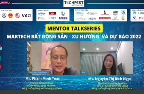 Ngày 3.11, trong khuôn khổ TECHFEST 2021 đã diễn ra buổi mentor với nội dung “MARTECH Bất động sản – xu hướng và dự báo năm 2022”, ông Phạm Minh Toàn – Founder TimeUniversal chia sẻ “Trong năm 2022, việc ứng dụng công nghệ và số hoá vào marketing BĐS sẽ diễn ra mạnh mẽ hơn bao giờ hết”.