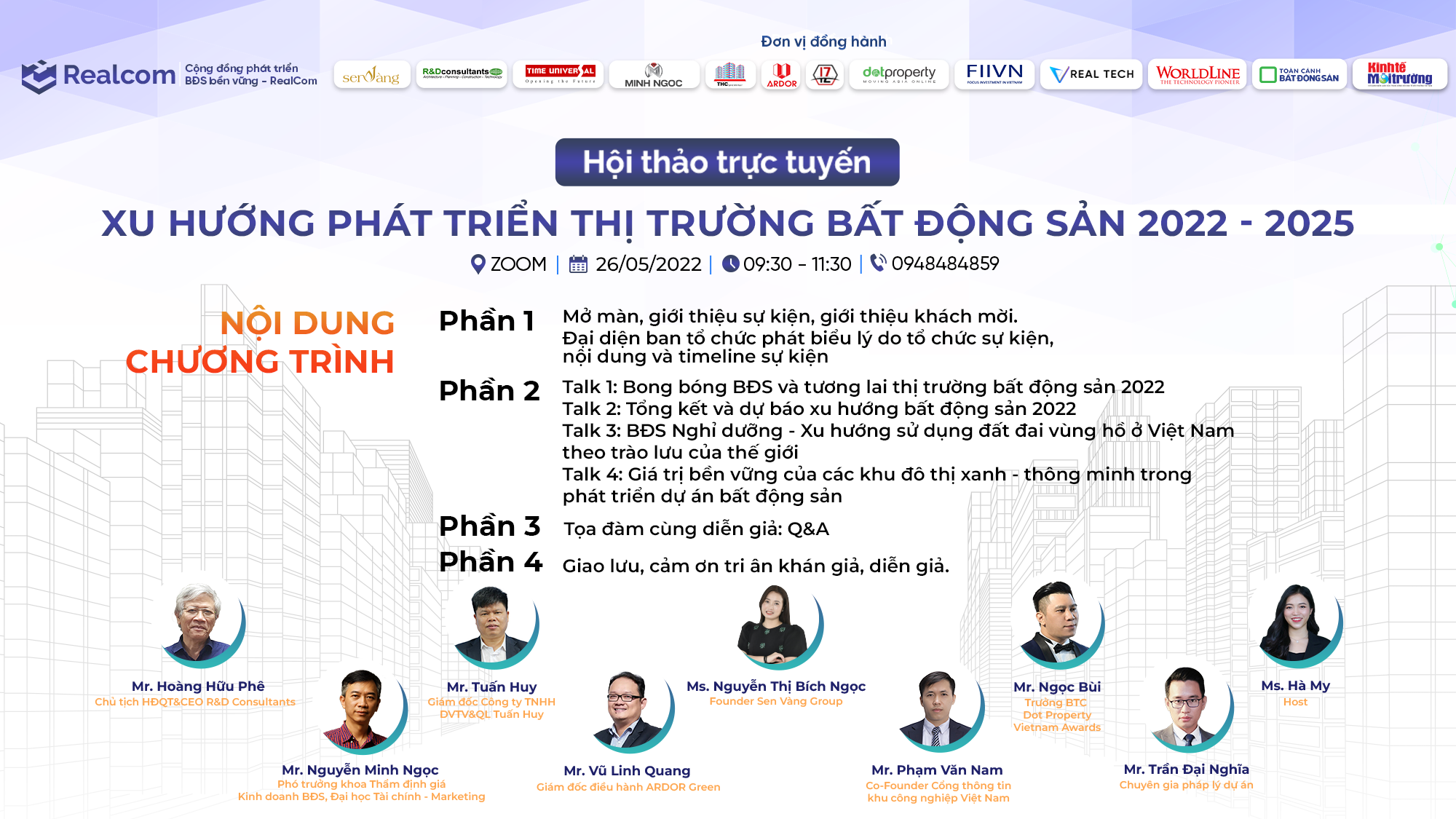 Sáng ngày 26/05/2022, Realcom – Cộng đồng phát triển bền vững đã phối hợp với các đơn vị tổ chức buổi hội thảo trực tuyến “Xu hướng phát triển thị trường bất động sản 2022-2025” mang đến nhiều thông tin, góc nhìn mới liên quan đến thực trạng, tiềm năng của thị trường để từ đó có những góc nhìn và định hướng đầu tư bất động sản phù hợp.